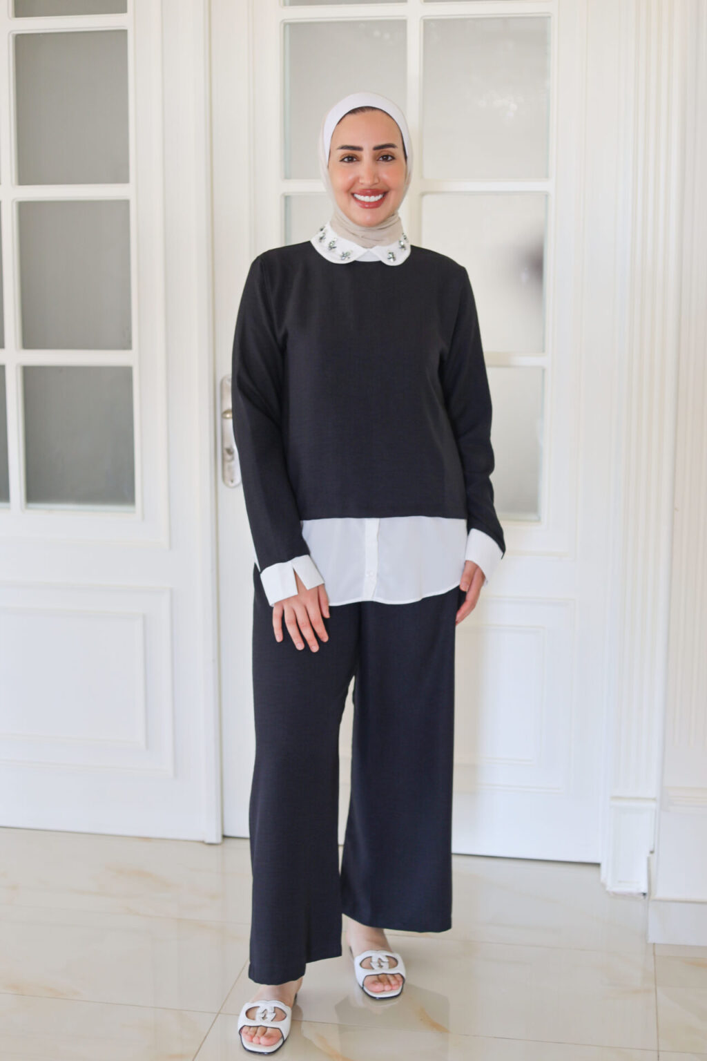 طقم قطعتين بلوز مع قميص متوسط الطول و بنطلون رجل واسعة