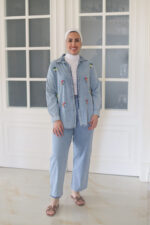 Two-piece jeans set with beaded jacket and wide leg trousers