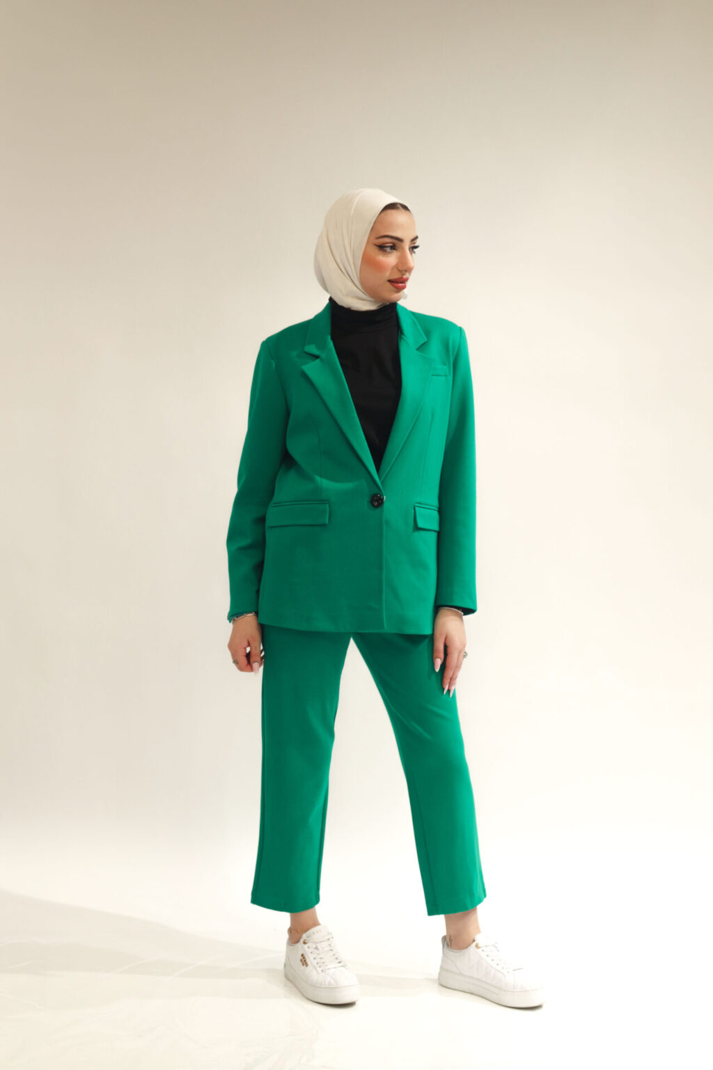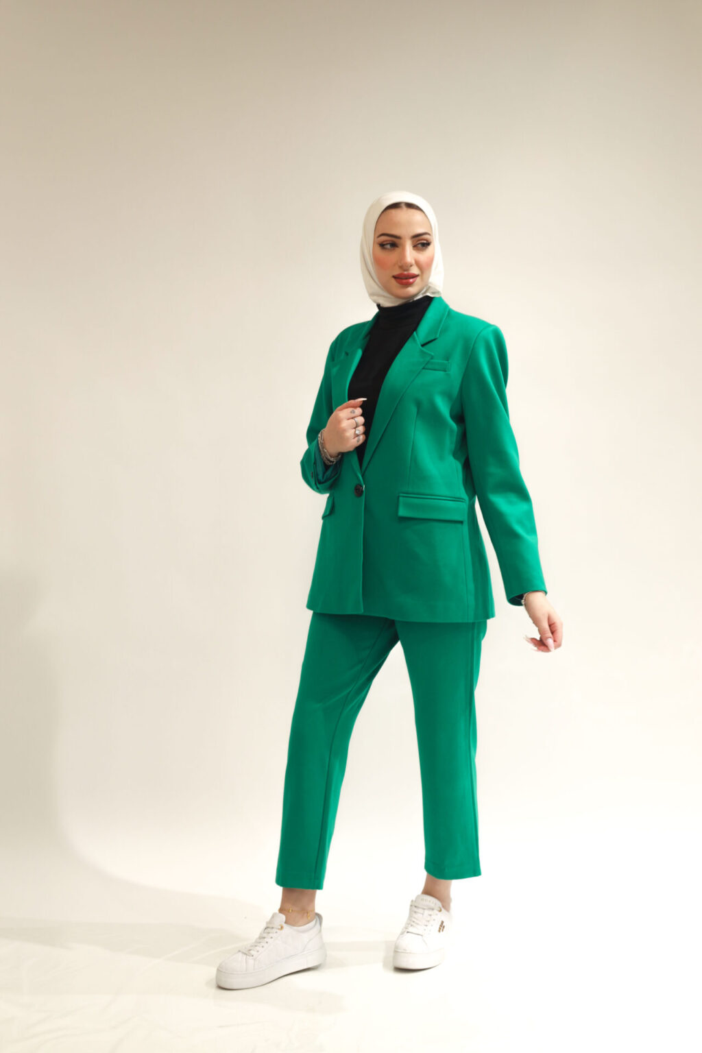 A formal two-piece autumn/winter set with buttons on the hands and a medium length